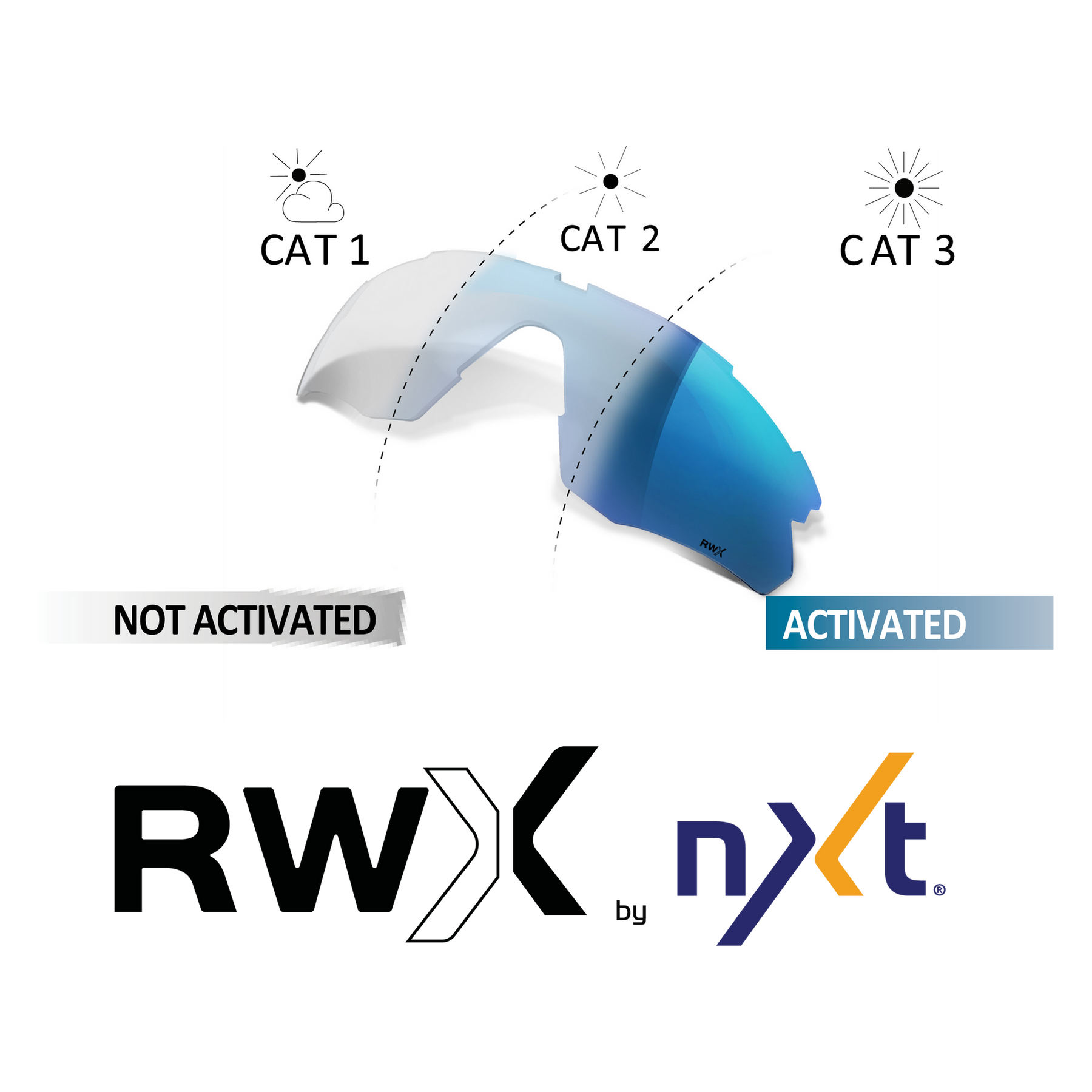 The RWX lens is photochromic, light adaptive with an improved enhanced technology meaning the RWX activates and fades at a faster rate using fast kinetics and colour differentiation. The RWX by NXT ranges from Category 1 to Category 3, suitable for cloudy days through to full sun. As well as this, the lens also has a subtle gloss appearance when not activated and when activated the blue mirror surfacing becomes more intense contributing to reduced glare and eye fatigue.